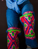 - Broderie géométrique multicolore (violet, vert fluo, jaune) sur le bas des jambes à l’avant