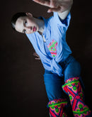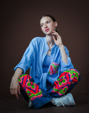 Adorned with purple, neon green, and saffron yellow embroidery, each leg becomes a living tableau—a tribute to a free, generous youth proudly rooted in textile art. A piece to dare, assert, and celebrate.