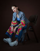Ce caftan ouvert en denim gris casse les codes : entre structure sobre et broderies berbères en néon éclatant, il affirme une présence graphique puissante.