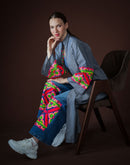- Broderies artisanales multicolores fluo (rose, rouge, vert, jaune) le long de l'ouverture et sur les manches